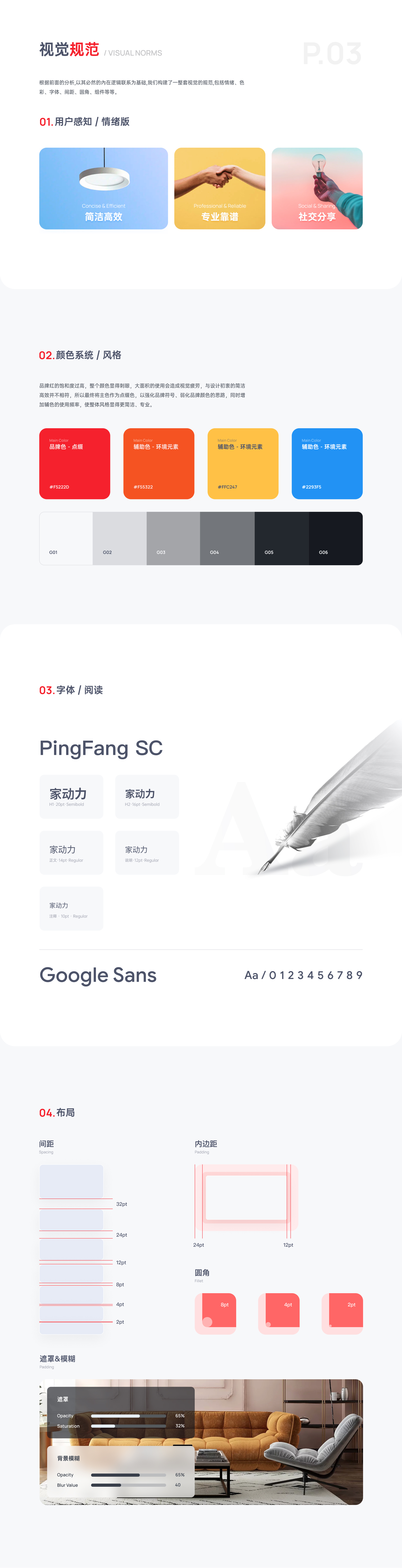 4.项目中遇到最大的问题就是整体的风格制定,因为考虑到业主的平均年龄和使用周期;最后使用的强调品牌dna、弱化品牌颜色为出发点,整体视觉风格设定为简洁、可靠、分享。